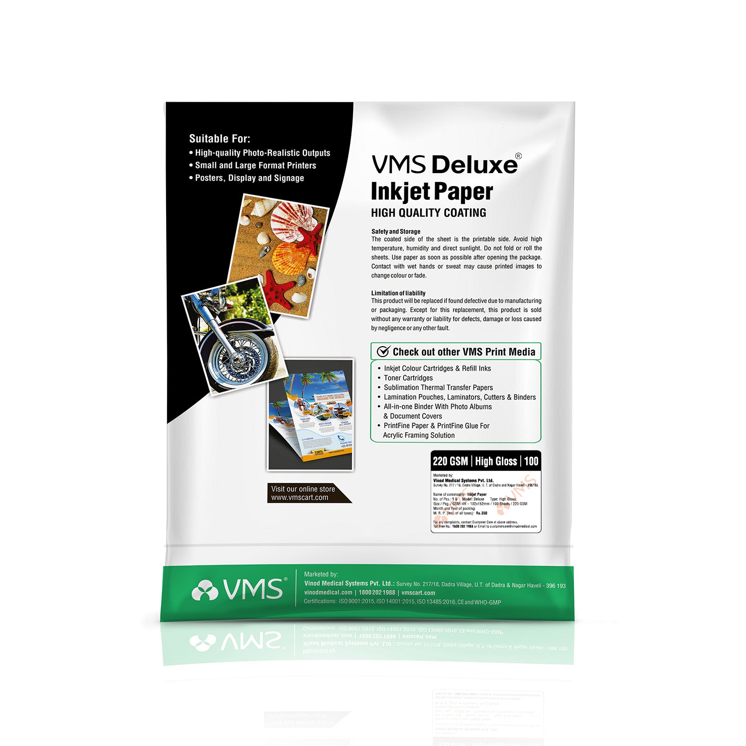 - Economical Printing: The VMS Deluxe 220 GSM Glossy Photo Paper is a Cast Coated inkjet media that provides crisp and vibrant image reproduction at an economical price.